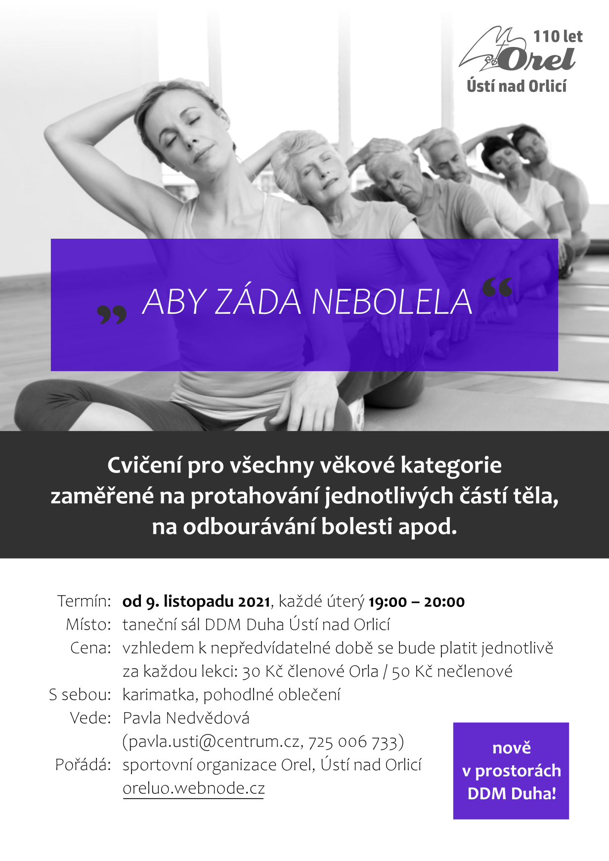 Od 9. listopadu 2021 bude nově cvičení probíhat každé úterý od 19:00, a to v tanečním sálu DDM Duha Ústí nad Orlicí.